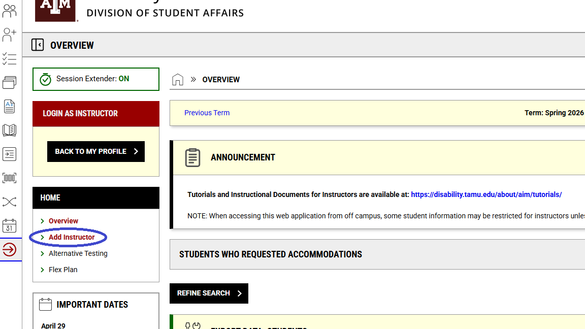 AIM does have a tool that provides a way to add additional staff (i.e. teaching assistants, administrative staff, course coordinator) to have access to be able to review the information available in AIM and help with completing AIM tasks (i.e. Testing Agreements, uploading/downloading exams) through the “Add Instructor” tool.